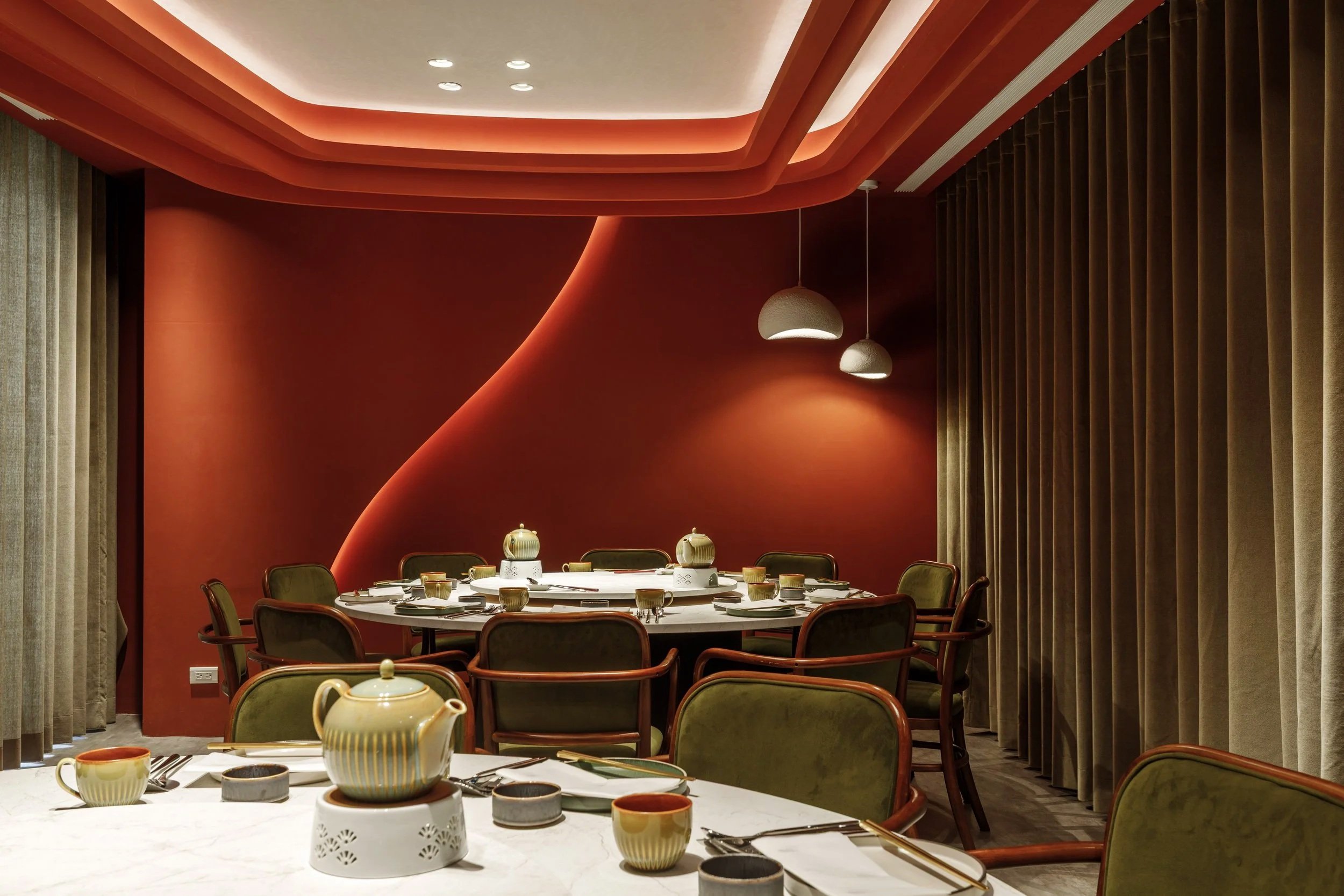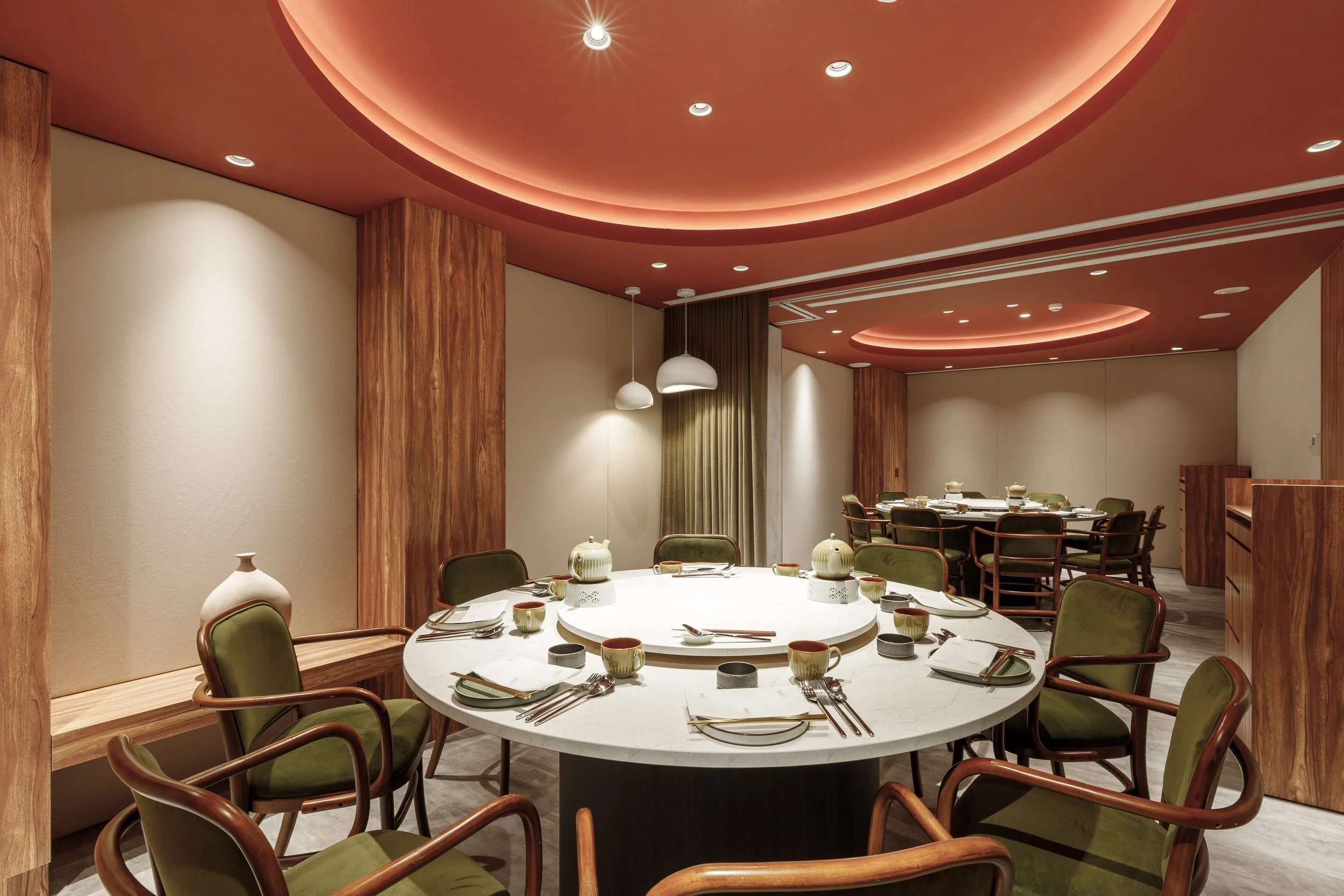 整體以木皮、奶油色與磚紅色交織,呈現溫潤細膩的層次感,開放式座位區延續侘寂的靜謐精神,以柔光勾勒建築結構的弧度,展現當代粵菜餐廳的雅緻新風貌。